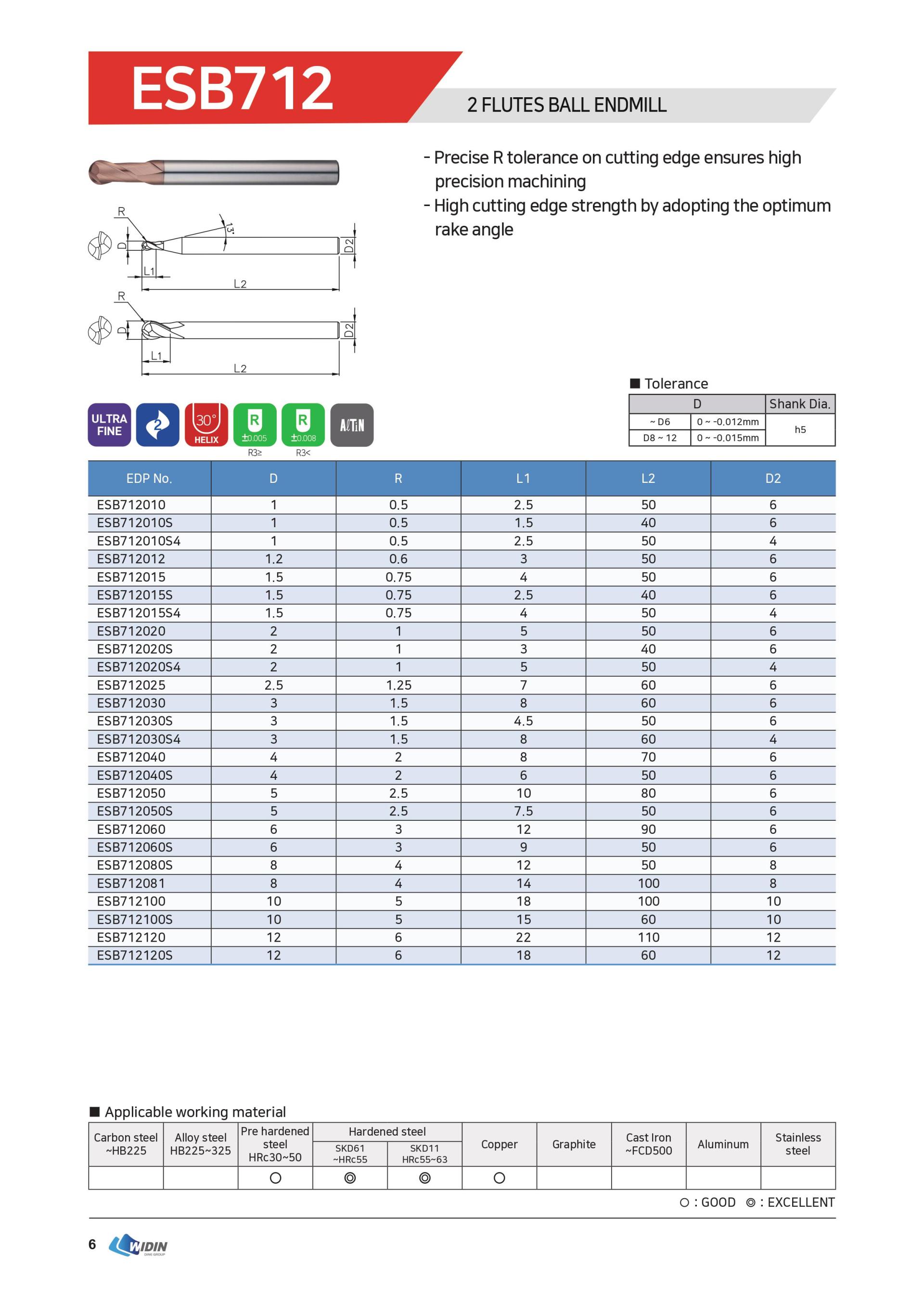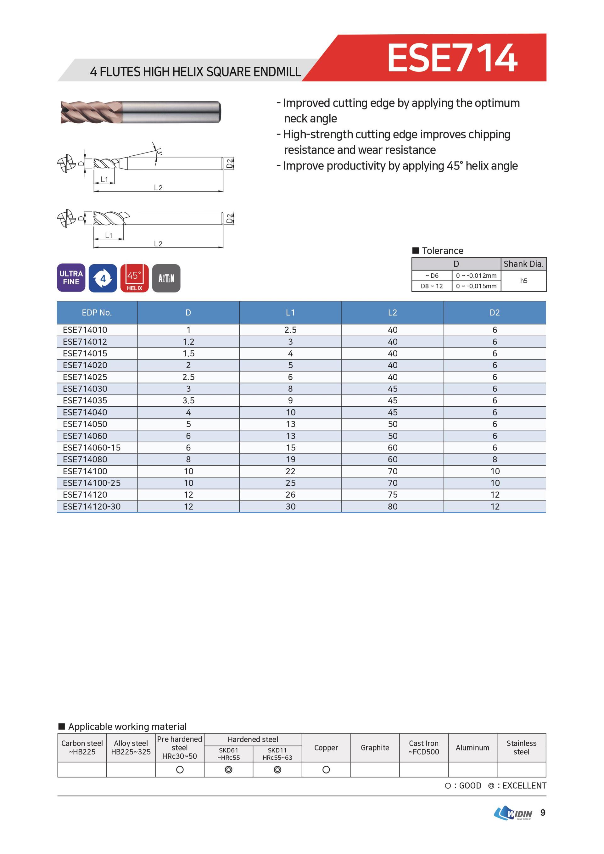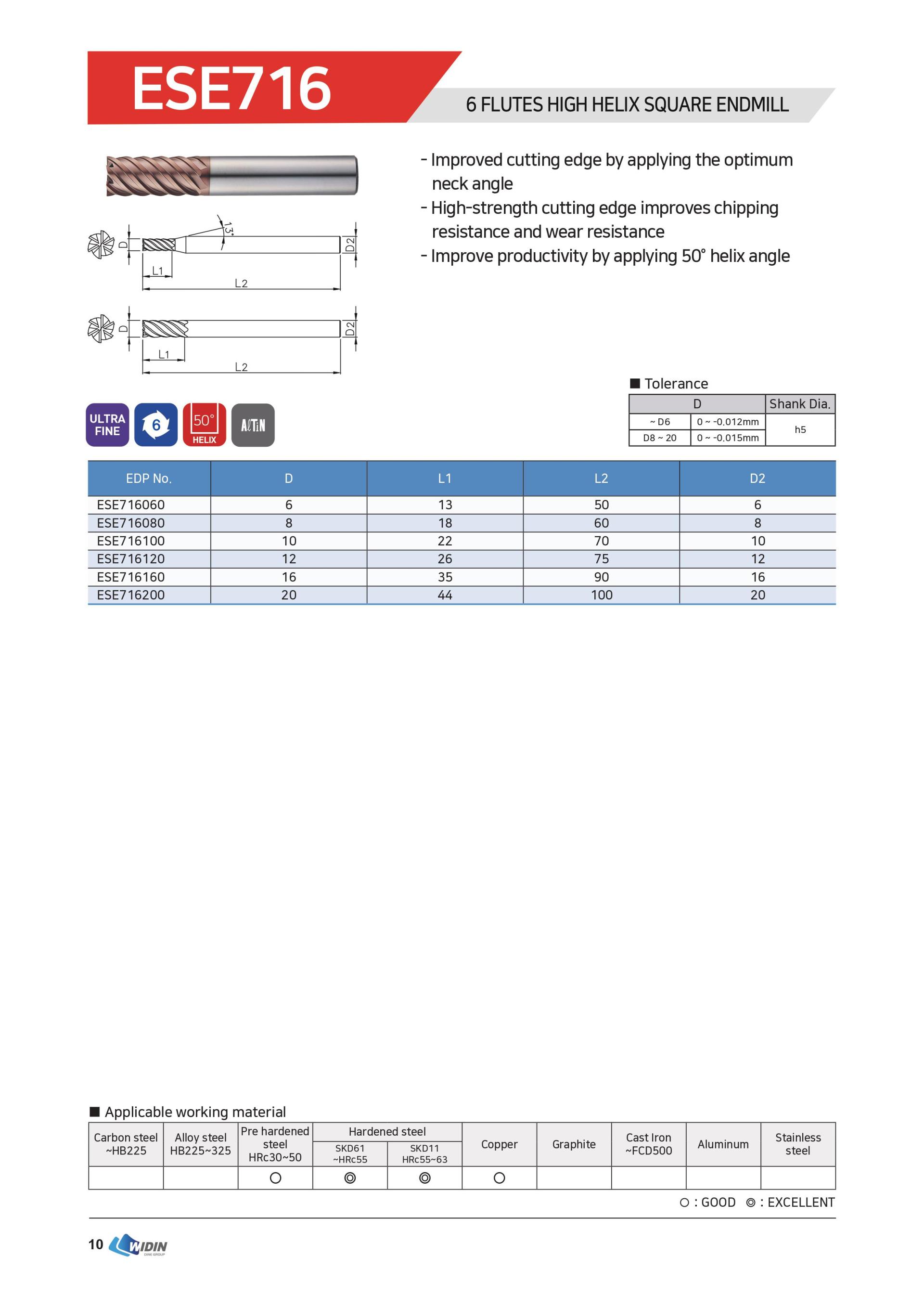 Dao Phay Ngón, Dao cầu ESB702, ESB712, ESE702, ESE704, ESE714, ESE716 – Widin Gia công Độ cứng: 50~63HRC