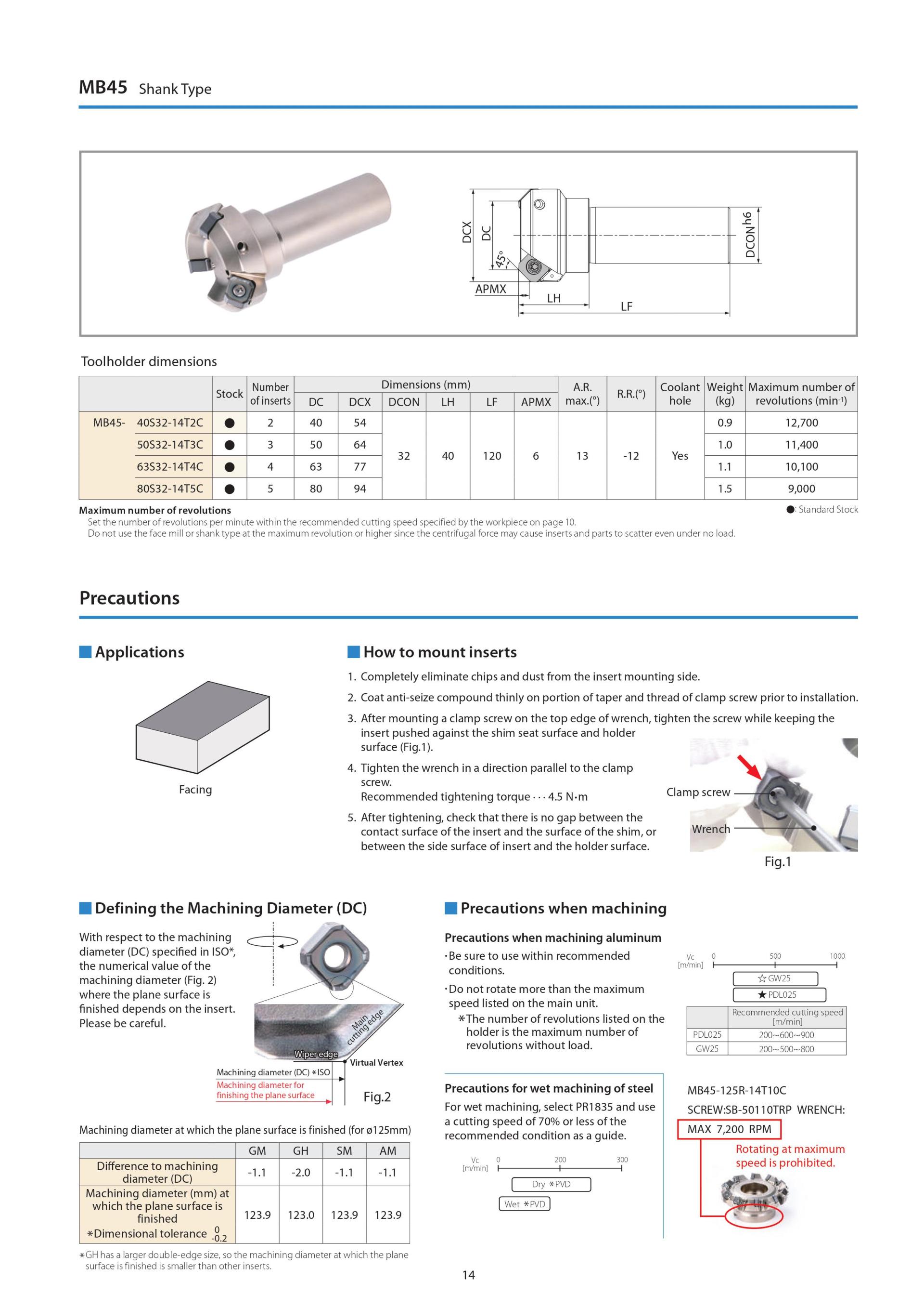 - Đường kính dao từ 40 - 80mm đối với cán chuô trụ 32mm và từ 40 - 315mm đối với Face Mill.